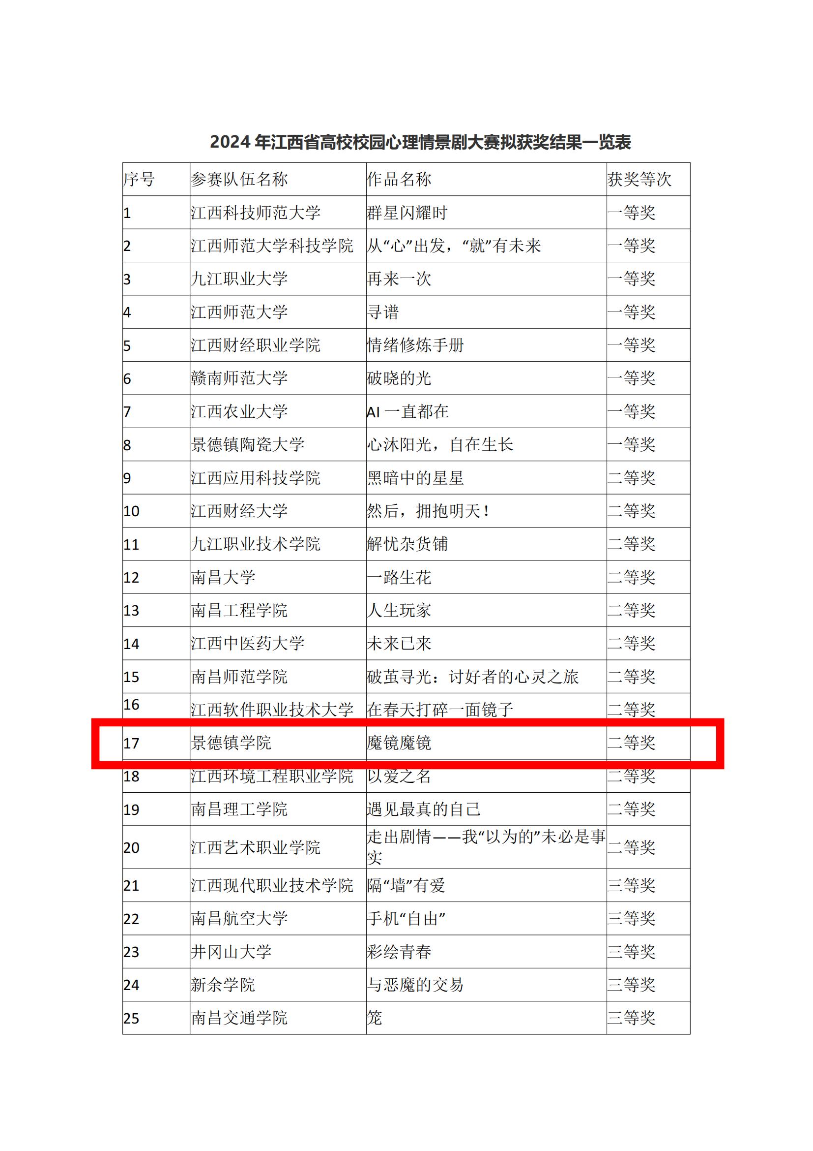 (本网讯:文|周晓舟/图|孔令乐)根据《关于组织开展2024年全省大学生“5·25”心理健康教育系列活动的通知》工作安排,5月10日-29日期间,省教育厅举办了2024年江西省高校校园心理情景剧大赛、全省第三届高校心理健康教育教师职业能力大赛,共有全省108所高校、111名心理健康教育教师参赛。我校推送的心理情景剧《魔镜魔镜》荣获2024年江西省高校校园心理情景剧大赛二等奖,董帅老师荣获全省第三届高校心理健康教育教师职业能力大赛二等奖。