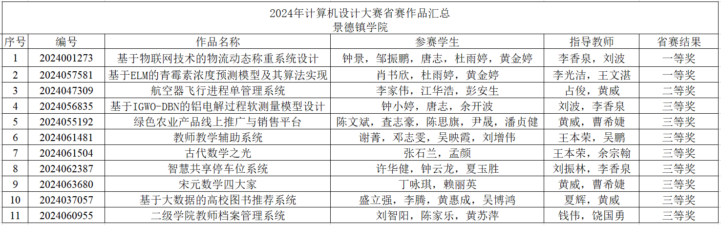 (本网讯:刘波)2024年中国大学生计算机设计大赛江西省赛区组委会发布获奖名单,我校报送的12项参赛作品有11项位列榜单,其中一等奖2项、二等奖1项、三等奖8项。由信息工程学院李香泉、刘波老师指导的学生团队“基于物联网技术的物流动态称重系统设计”和李光洁、王文湛老师指导的学生团队“基于ELM的青霉素浓度预测模型及其算法实现”入围国赛。
