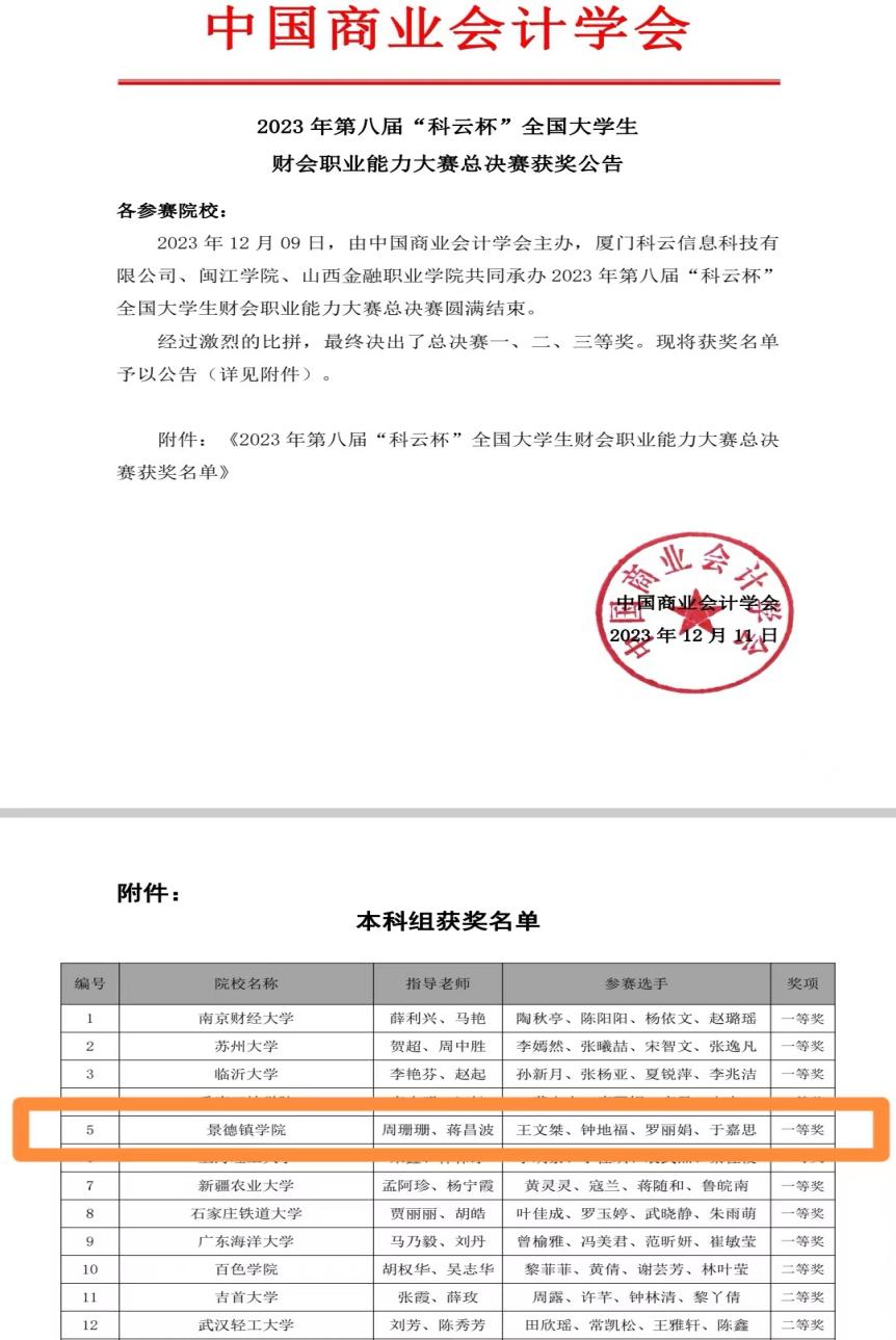 (本网讯:王文桀)近日,由中国商业会计学会主办的第八届“科云杯”全国大学生财会职业能力大赛总决赛在线上成功举办。经济管理学院财务管理专业的王文桀、钟地福、罗丽娟、于嘉思四位同学在周珊珊、蒋昌波老师的指导下,经过艰苦的训练,取得了全国一等奖的优异成绩。