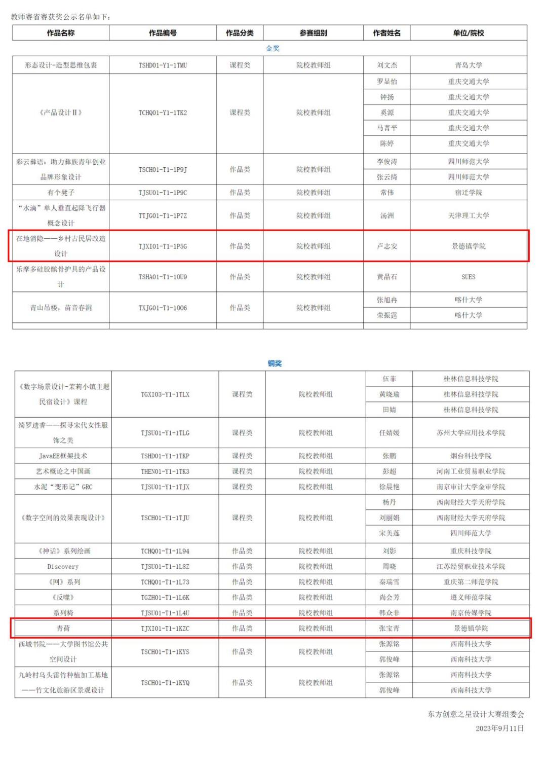 (本网讯:卢志安)近日,第四届“东方创意之星教师教学创新大赛及学生赛”江西赛区省赛获奖名单正式揭晓,环境设计专业教师卢志安报送的《在地消隐——乡村古民居改造设计》荣获江西省赛区“金奖”,陶瓷艺术专业教师张宝青报送的《青荷》荣获江西省赛区“铜奖”,由王怀忠老师指导的环境设计专业学生陈群作品《骑行U空间》荣获江西赛区“银奖”。