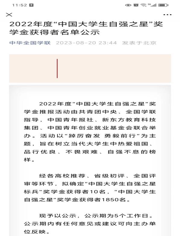 2022年度“中国大学生自强之星”奖学金获得者公示名单 图片源自中华全国学联公众号