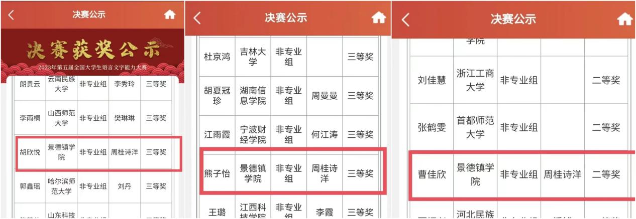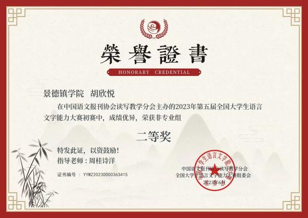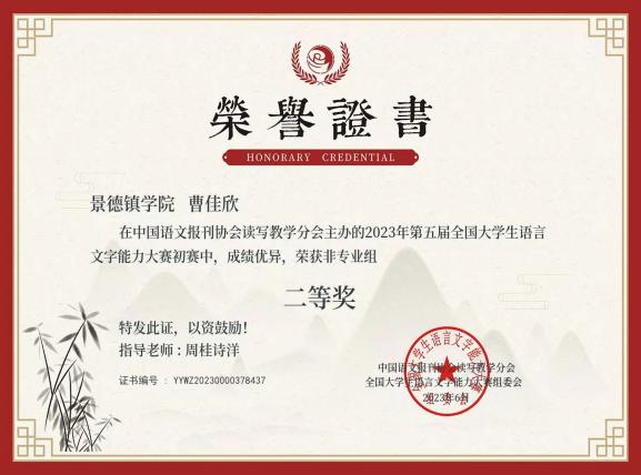 (本网讯:曹佳欣)近日,由中国语文报刊协会读写教学分会主办的2023年第五届全国大学生语言文字能力大赛圆满结束。我校教育学院选派的4名同学在周桂诗洋老师指导下取得优秀成绩:获初赛一等奖1项,二等奖3项,其中3名同学在决赛中也表现优异,获决赛二等奖1项,三等奖2项。