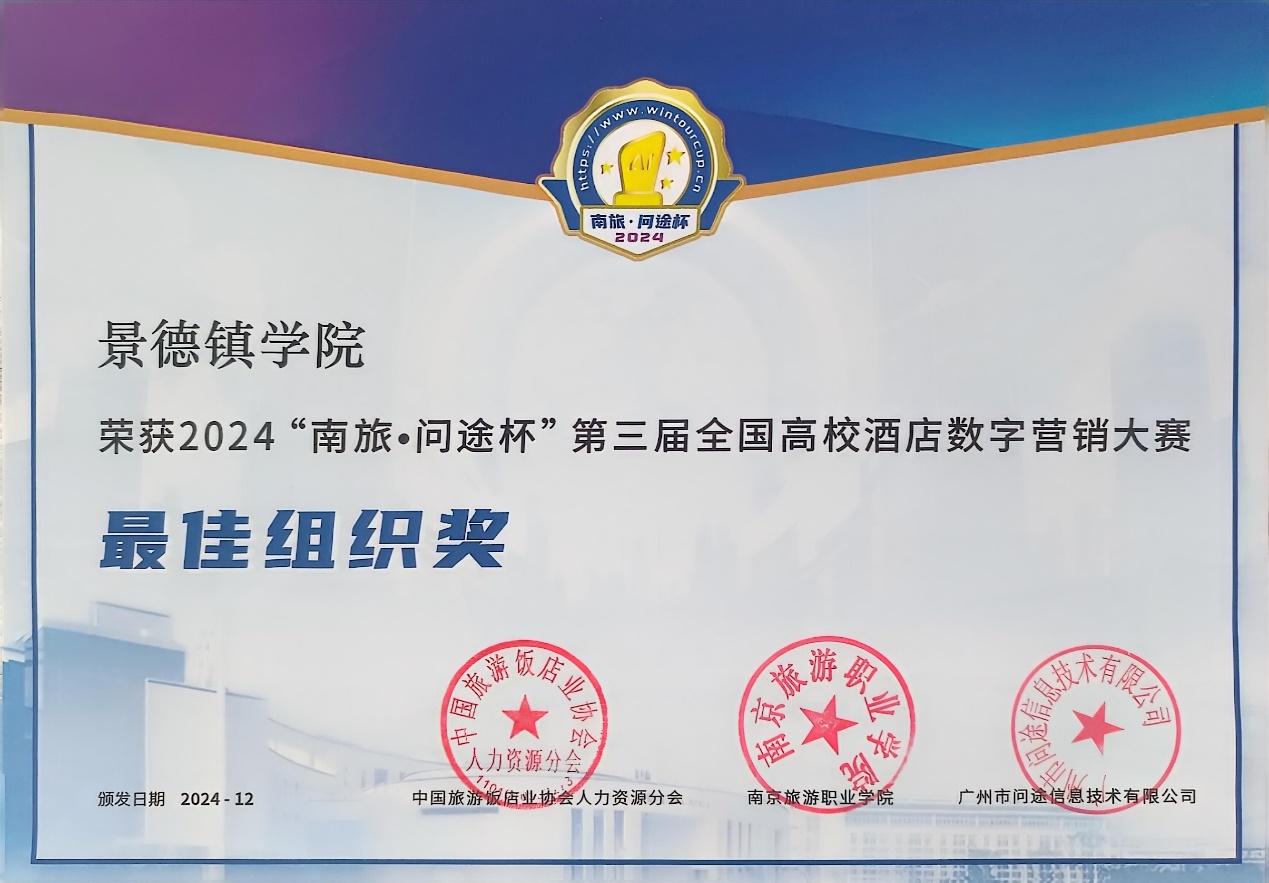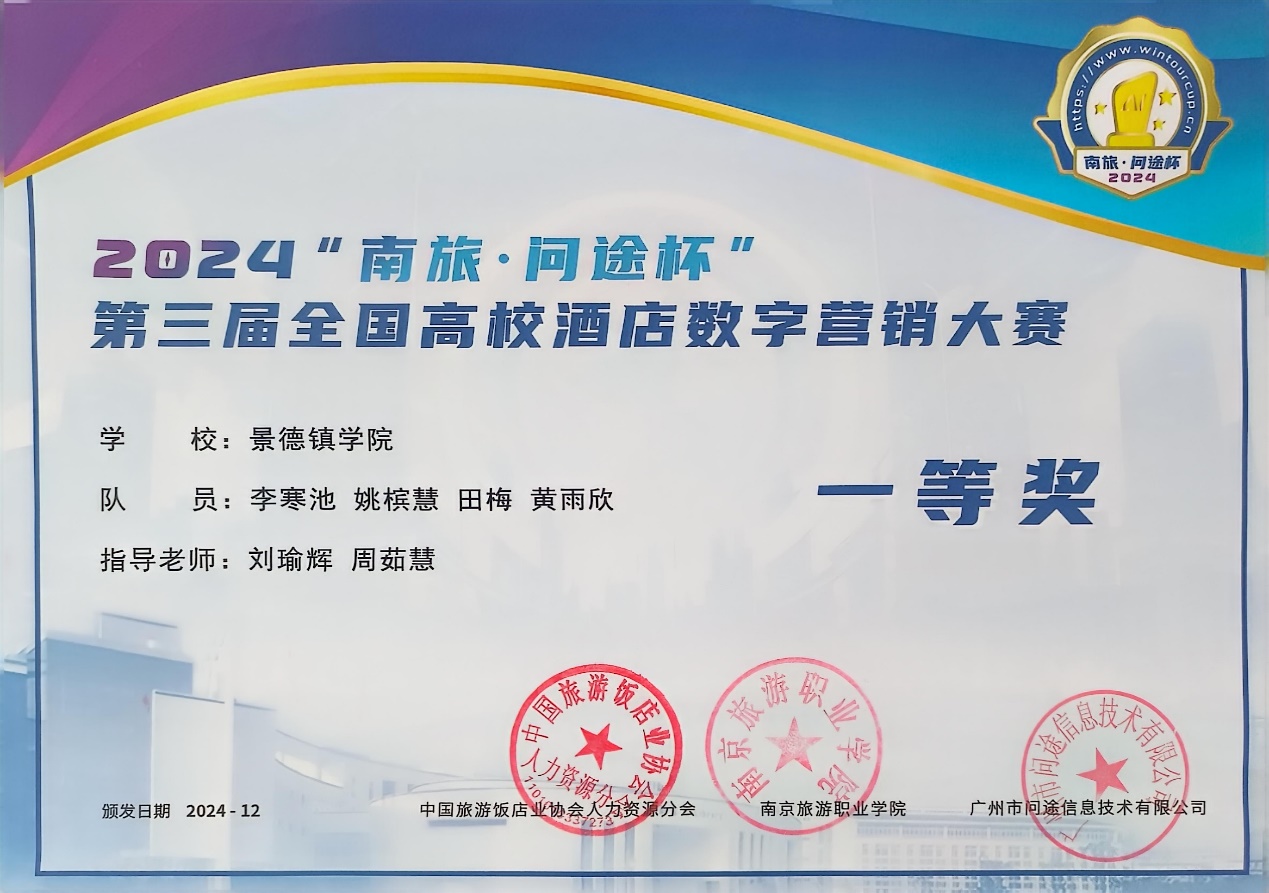 (本网讯:文|陈梦艳/图|李寒池)近日,2024年“南旅·问途杯”第三届全国高校酒店数字营销大赛于12月7日正式落下帷幕。我校经济管理学院酒店管理专业李寒池、黄雨欣、姚槟慧、田梅4名同学组成“瓷光璀璨队”在刘瑜辉和周茹慧老师的指导下,从全国128所院校273支队伍中脱颖而出,进入全国总决赛,最终喜获一等奖。我校荣获“最佳组织奖”。