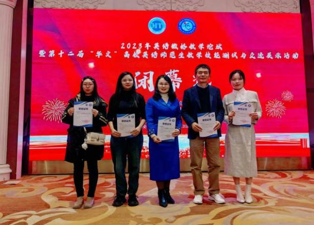 (本网讯:欧阳磊奕、吴俊芳、张蓉)11月27日,英语微格教学论坛暨第十二届“华文”高校英语师范生教学技能测试与交流展示活动在安徽工业大学圆满落幕。我校外国语学院和教育学院5名参赛学子斩获荣誉,其中由教育学院教师欧阳磊奕指导的21小教1班欧阳春萌获得教学项目一等奖和教学技能项目二等奖;由外国语学院教师张蓉、秦玉芳指导的21英语2班许夏晴获得教学设计项目一等奖和教学技能项目二等奖;由外国语学院教师欧飞兵、吴俊芳指导的21英语2班龙钰琳获得教学技能项目一等奖和教学设计项目二等奖;由外国语学院教师江凌、付翠指导的22英语1班金丽霞获得教学设计二等奖和教学技能项目三等奖;由教育学院欧阳磊奕指导的21小教1班熊詹妮获得教学设计三等奖和教学技能三等奖。此次比赛,校教学质量监控与评估处处长夏小红教授受邀担任次大赛的评委和论坛的主旨报告专家,教育学院党委委员、副院长黄书生受邀担任评委和颁奖嘉宾。