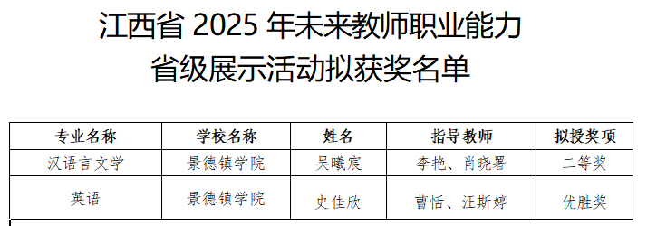 (本网讯:黄依婷)近日,由江西省教育厅主办、江西师范大学承办的“2025年全省未来教师职业能力省级展示暨总结交流活动”在江西师范大学瑶湖校区圆满落幕。经过激烈角逐,我校汉语言文学专业吴曦宸同学荣获二等奖,英语专业史佳欣同学获得优胜奖,为学校赢得了荣誉。