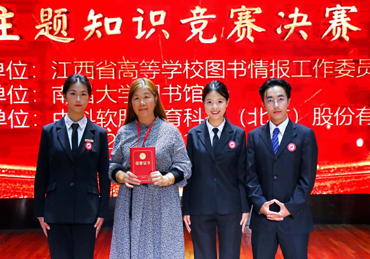 (本网讯:校图书馆)近日,在南昌大学落下帷幕的2025年江西省高校图书馆中科杯“文化润心 精神铸魂”主题知识竞赛”中,我校参赛队伍(队员:钟佳玲、杜佳骏、刘孟婷)以总分99.58的成绩斩获一等奖,钟媛玲老师荣获优秀指导老师奖,校图书馆荣获优秀组织奖。
