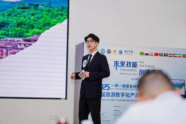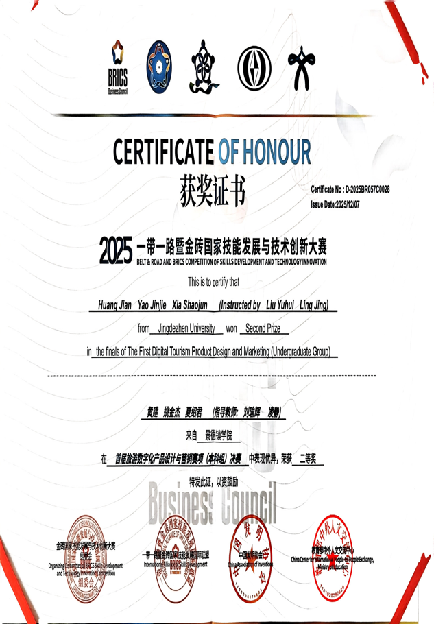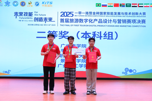 (本网讯:经济管理学院)12月7日,2025年“一带一路”暨金砖国家技能发展与技术创新大赛首届旅游数字化产品设计与营销赛项全国总决赛在海南经贸职业技术学院圆满落幕。我校经济管理学院2023级酒店管理班黄建、姚金杰、夏绍君三位同学组成的“瓷光数影”队,在刘瑜辉、凌静两位教师的指导下,凭借扎实的专业功底与创新的实践方案,斩获本科组二等奖,为学校赢得荣誉。