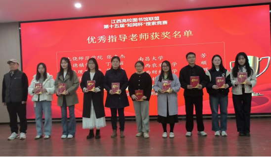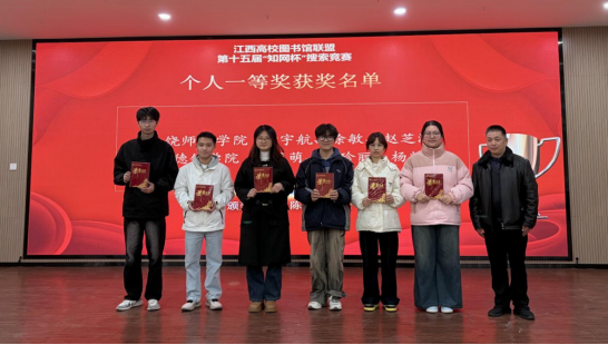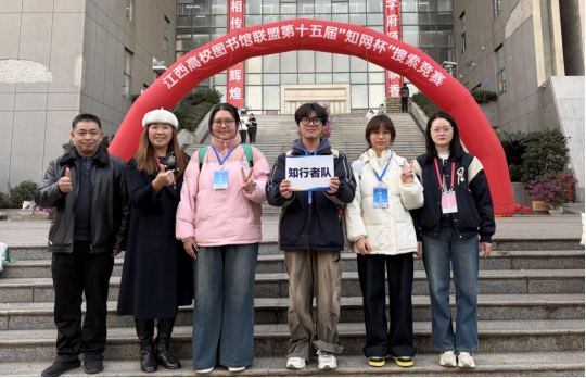 (本网讯:丁晓丽)近日,江西高校图书馆联盟第十五届“知网杯”信息搜索竞赛决赛在江西农业大学落下帷幕。经过多轮激烈角逐,我校由生环学院24级茶学1班杨燚、24级生物工程1班周萌、人文学院23级汉语言文学2班陈珍丽组成的“知行者队”在决赛中荣获团体一等奖,图书馆丁晓丽老师荣获“优秀指导老师”称号。