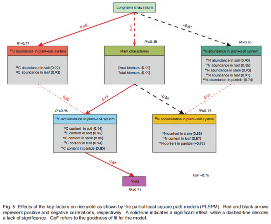 研究还通过偏最小二乘路径模型 (PLS-PM) 分析进一步明确,水稻产量的提升主要得益于秸秆还田促进的光合碳在植株-土壤系统中的积累。该研究明确了稻草还田在增产固碳方面的双重效益,也为我国水稻生产系统中秸秆资源化利用与化肥减施增效提供了理论依据和技术支撑。