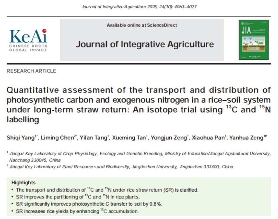(本网讯:生环学院)近日,我校生物与环境工程学院青年教师陈丽明博士,与江西农业大学研究团队合作,在农林科学领域国际权威期刊《Journal of Integrative Agriculture》上发表题为“Quantitative assessment of the transport and distribution of photosynthetic carbon and exogenous nitrogen in a rice–soil system under long-term straw return: An isotope trial using 13C and 15N labelling”的研究成果。