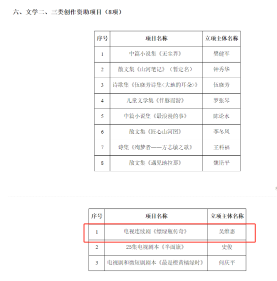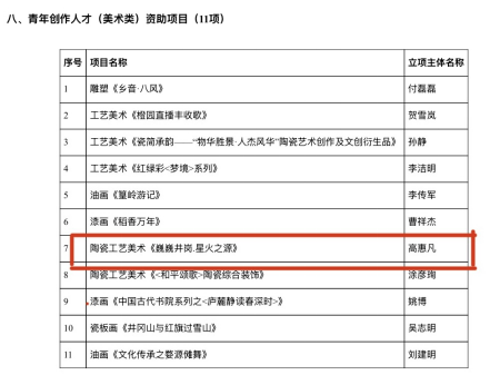 (本网讯:艺术学院)近日,江西省文化艺术基金2025年度立项项目名单正式公布,我校陶瓷美术与设计艺术学院高惠凡教师申报的“陶瓷工艺美术《巍巍井冈·星火之源》”项目成功入选青年创作人才(美术类)资助项目。陶瓷文化交流与研究中心(国际交流与教育学院)副主任(副院长)吴维惠申报的“电视连续剧《缥绿瓶传奇》”项目成功入选文学创作资助项目。
