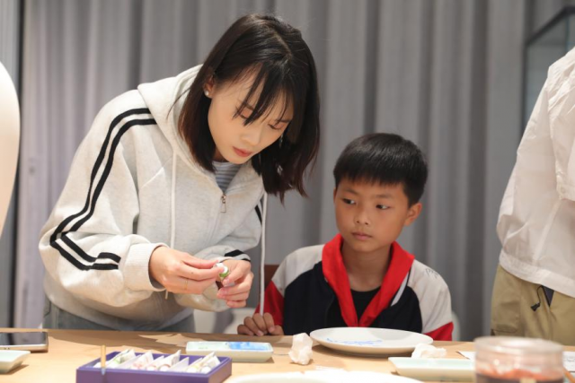 活动现场,艺术教育专业学子充分发挥专业优势,围绕陶瓷历史文化、釉上绘画技艺展开文艺交流互动与深度创意实践。他们结合景德镇陶瓷文化底蕴,从颜料调配、构图设计到笔触运用,为研学团队细致讲解传统釉上彩绘的核心技法,现场示范创作流程。在学子们的指导下,香港浸会大学师生与罗家学校学员亲手执笔,将创意融入瓷盘,完成了一幅幅独具特色的釉上绘画作品。
