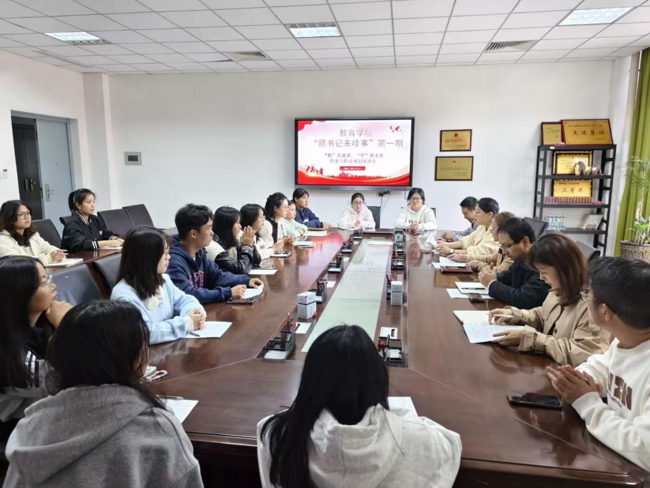 (本网讯:文/丁美燕|图/邹翼)为落实立德树人根本任务,建立院党委书记常态化联系学生机制,促进思政教育与学生成长成才深度融合,同步响应学校近期创新推出的“我跟书记来‘哇事’”思政品牌活动,教育学院近日在党员活动室开展了“我跟书记来哇事”活动,以“‘职’点迷津,学筑未来”为主题,围绕学业规划、职业发展、技能提升等成长话题展开互动讨论。教育学院党委书记李莉、院党委副书记冯唐锴等出席会议。