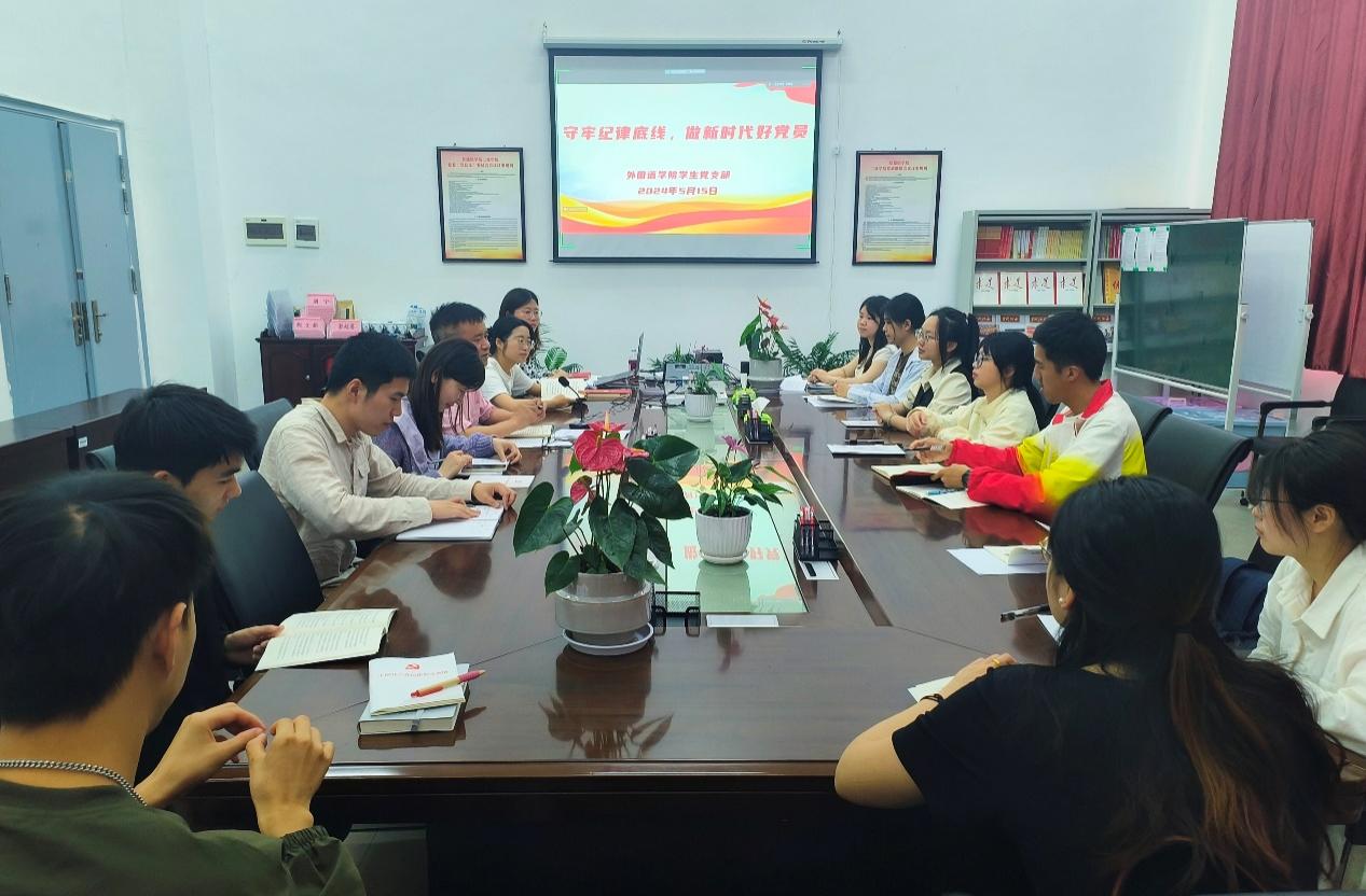 (本网讯:文/图许琳莹)为推动我院党纪学习教育走深走实,持之以恒推进全面从严治党,5月16日上午,外国语学院党委副书记黄华在学院五楼党员会议室以“守牢纪律底线做新时代好党员”为题,为外国语学院学生党支部全体师生党员上了一堂专题党课。