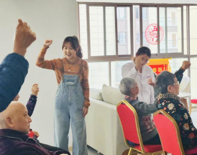 志愿者们为老人们带来的《拍拍操》活动练习,通过拍手掌、精细化动作训练,帮助老年人提升手眼协调能力,这套操法通过有节律地拍手和手臂动作,增强老年人的肢体活动范围。《经典歌曲回忆》通过听音频、猜歌曲来讲述音乐背后的故事,耳熟能详的现代歌曲《我和我的祖国》《咱当兵的人》《映山红》《难忘今宵》《歌唱祖国》《打靶归来》触动了老年人过去的记忆与情感。