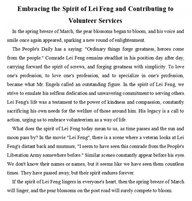 为了更好地传承雷锋精神,外国语学院组织了“学雷锋精神,献志愿服务”主题征文活动。外院学子积极响应,踊跃投稿。他们以独特的视角和生动的文字,讲述自身对雷锋精神的理解,表达了积极践行雷锋精神、服务社会的信心和热情,还有的同学结合自己的专业,用英文讲述雷锋精神,利用专业知识传播民族声音、内化民族精神、培养家国情怀。