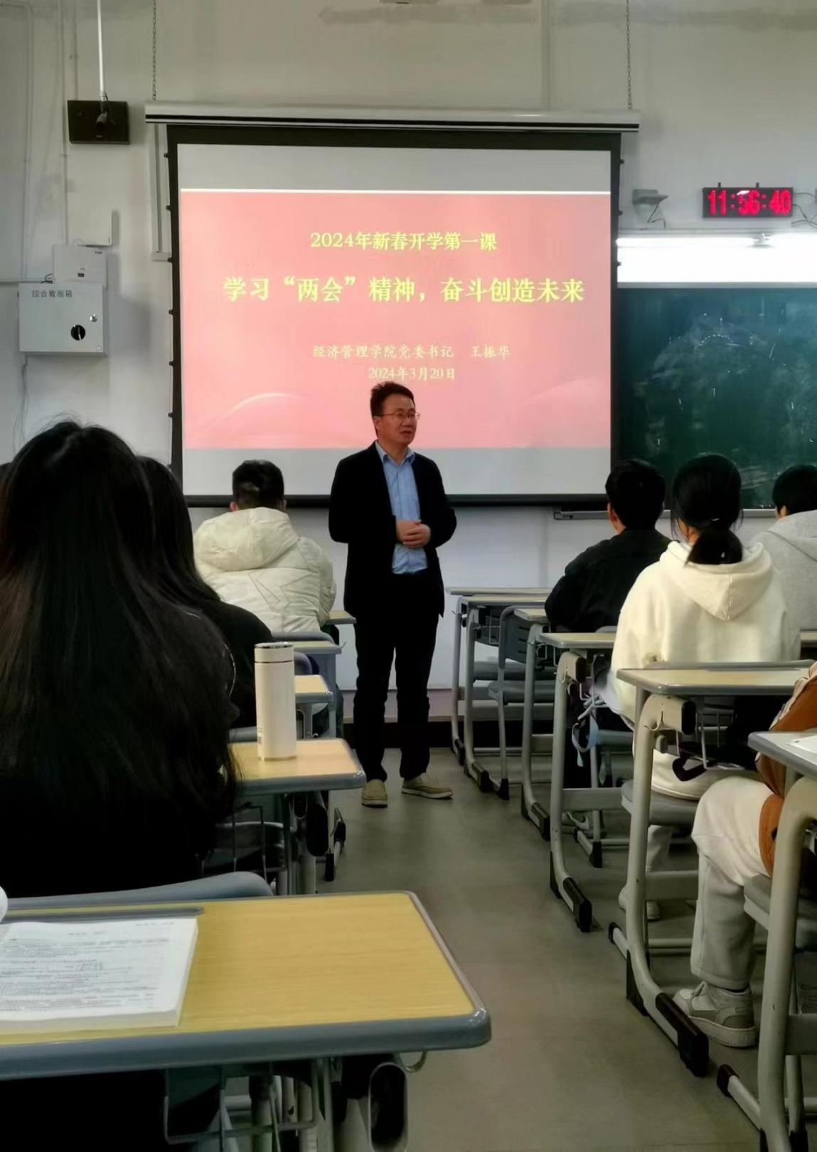 (本网讯:文/图邹佳利)为深入学习贯彻2024年全国两会精神,引导广大青年奋进新征程、建功新时代,3月20日,经济管理学院党委书记王振华在第二教学楼2201教室为联系班级讲授了一堂生动的“开学第一课”。2022级财务管理专业全体同学及学业导师参加学习。