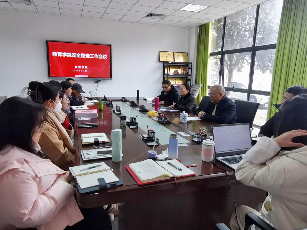 (本网讯:江霞琴)1月29日上午,教育学院在党员活动室召开安全稳定工作会议。教育学院党委书记李莉主持会议,党委副书记、院长冯兵,党委副书记冯唐锴,党委委员、副院长黄书生,副院长汪潇出席会议。