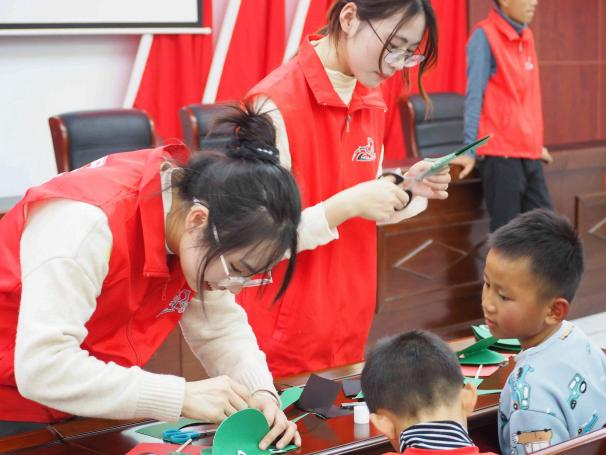 活动中,同学们把提前准备好的各种颜色卡纸、画笔、剪刀、吸管等材料分给参加活动的小朋友,向他们讲述并示范青蛙的制作方法,还一对一、手把手辅助小朋友们完成手工任务。在手工制作的过程中,小朋友们得到了锻炼独立思考和动手能力的机会,拓展了思维空间,更重要的是体验到了手工制作的乐趣。