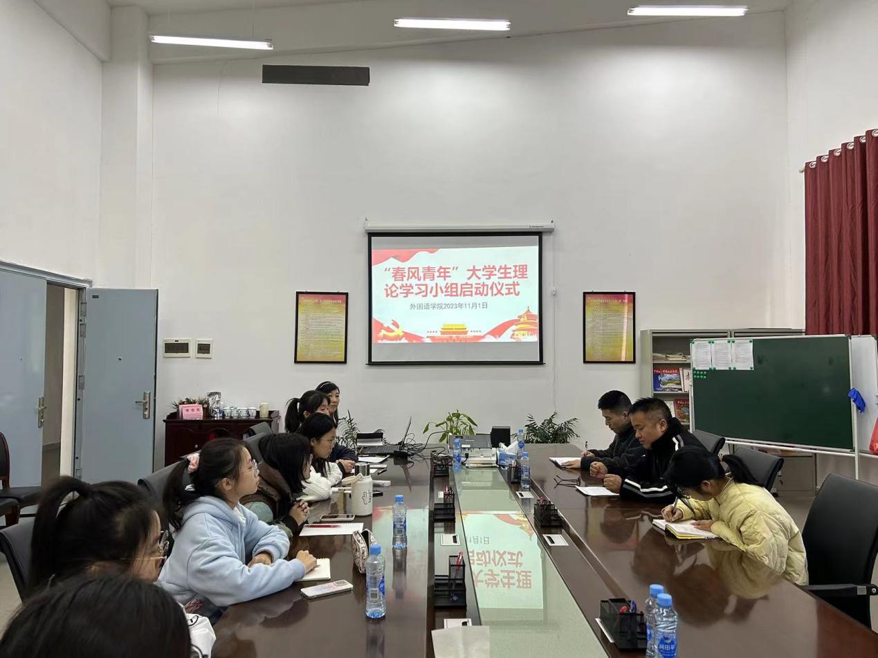 (本网讯:廖嘉艺)为深入贯彻习近平总书记在中央和国家机关党建工作会议上的重要讲话精神,加强外国语学院青年学生理论武装,提升青年学生理论素养,近日,外国语学院在五楼党员会议室举行“春风青年”大学生理论学习小组启动仪式。学院党委副书记黄华出席仪式,全体辅导员及理论学习小组成员参会。学院团委书记倪娅主持会议。