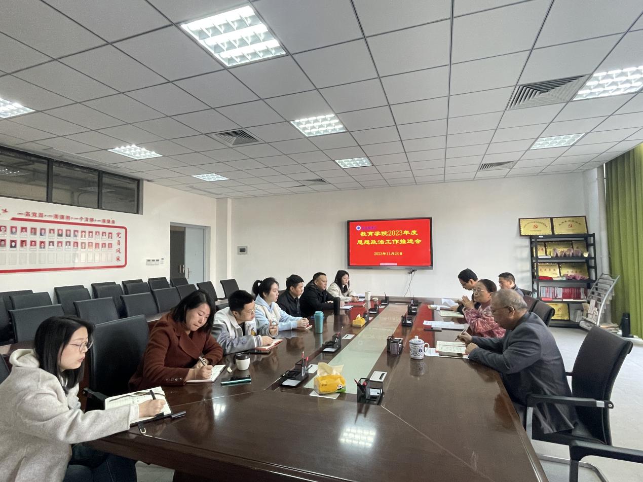 (本网讯:文|江霞琴/图|罗天天)为深入学习贯彻落实习近平新时代中国特色社会主义思想,推动教育学院思想政治工作高质量发展,11月24日上午,教育学院于党员活动室召开2023年度思想政治工作推进会。教育学院党委副书记、院长冯兵,党委副书记冯唐锴,副院长汪潇出席会议,教育学院党委书记李莉主持会议。