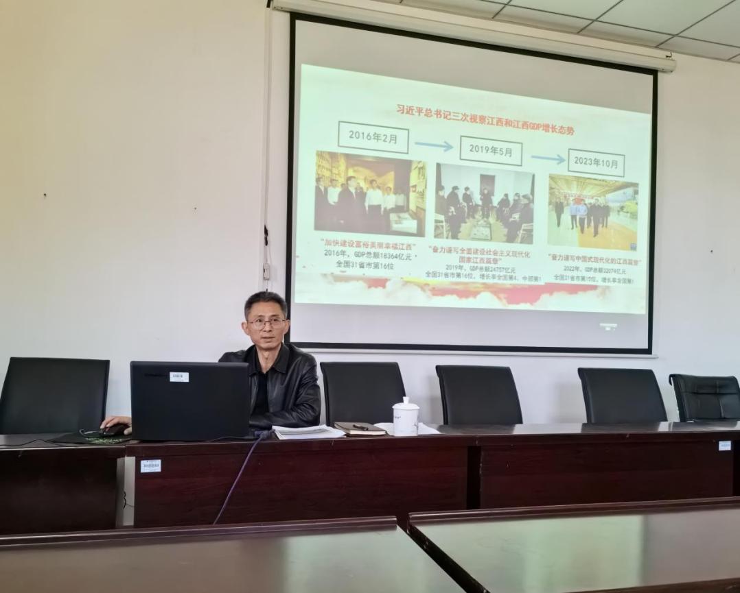 (本网讯:万丽佳)为深入学习贯彻习近平总书记视察江西重要讲话精神,牢记嘱托、感恩奋进,近日,外国语学院党委书记程立新在学院教工会议室为学院全体教职工讲授“习近平总书记考察江西重要讲话精神”专题党课。