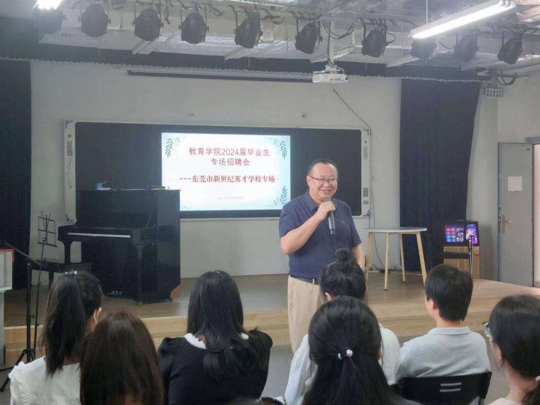 (本网讯:文|邓海琦/图|罗艺洋)为深入贯彻落实党中央、国务院关于促进毕业生就业的决策部署,搭建毕业生和用人单位双向沟通的桥梁,打好稳就业、促就业攻坚战,保障毕业生高质量就业,10月29日上午,教育学院在综合艺术实训室举办了东莞市新世纪英才学校2024届毕业生专场招聘宣讲会。东莞市新世纪英才学校董事会董事、总校长许明勇在会上做了精彩的宣讲,教育学院党委书记李莉,党委副书记冯唐锴参加宣讲会。