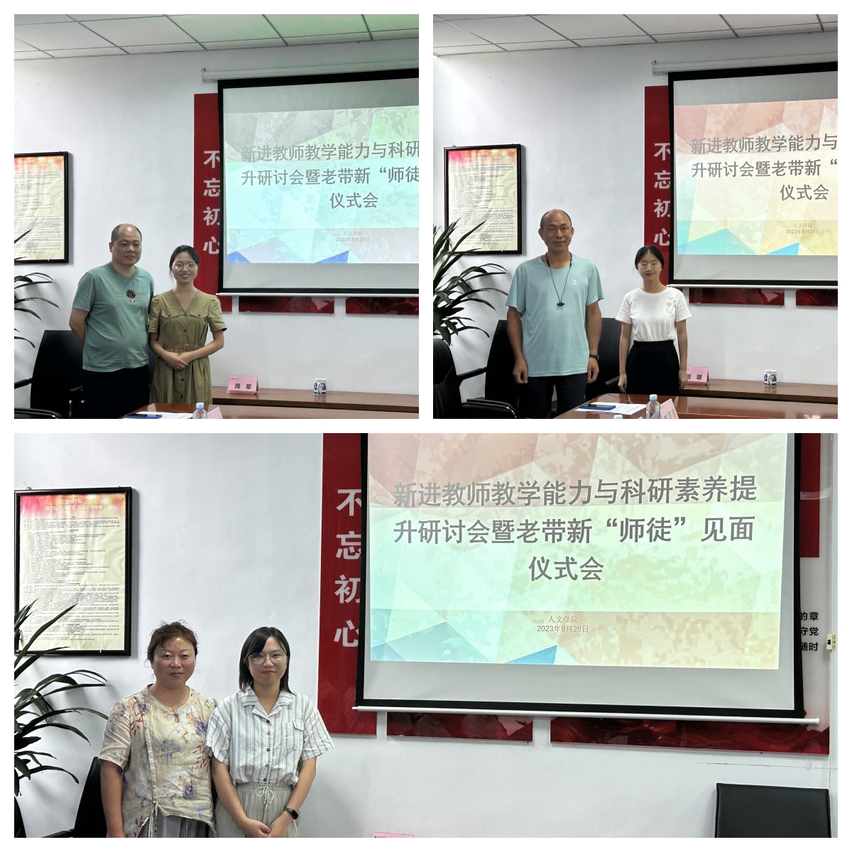 (本网讯:文|张帅/图|董馨玥)为进一步加强师资队伍建设,提高教学与科研水平,8月28日上午,人文学院在学院会议室举行2023年新入职教师教学能力与科研素养提升研讨会暨老带新“师徒”见面仪式会。人文学院党委书记江旺龙、院长陈猛、老教师代表余轩宇、姜源傅、李艳出席会议,人文学院副院长肖其峰主持会议。