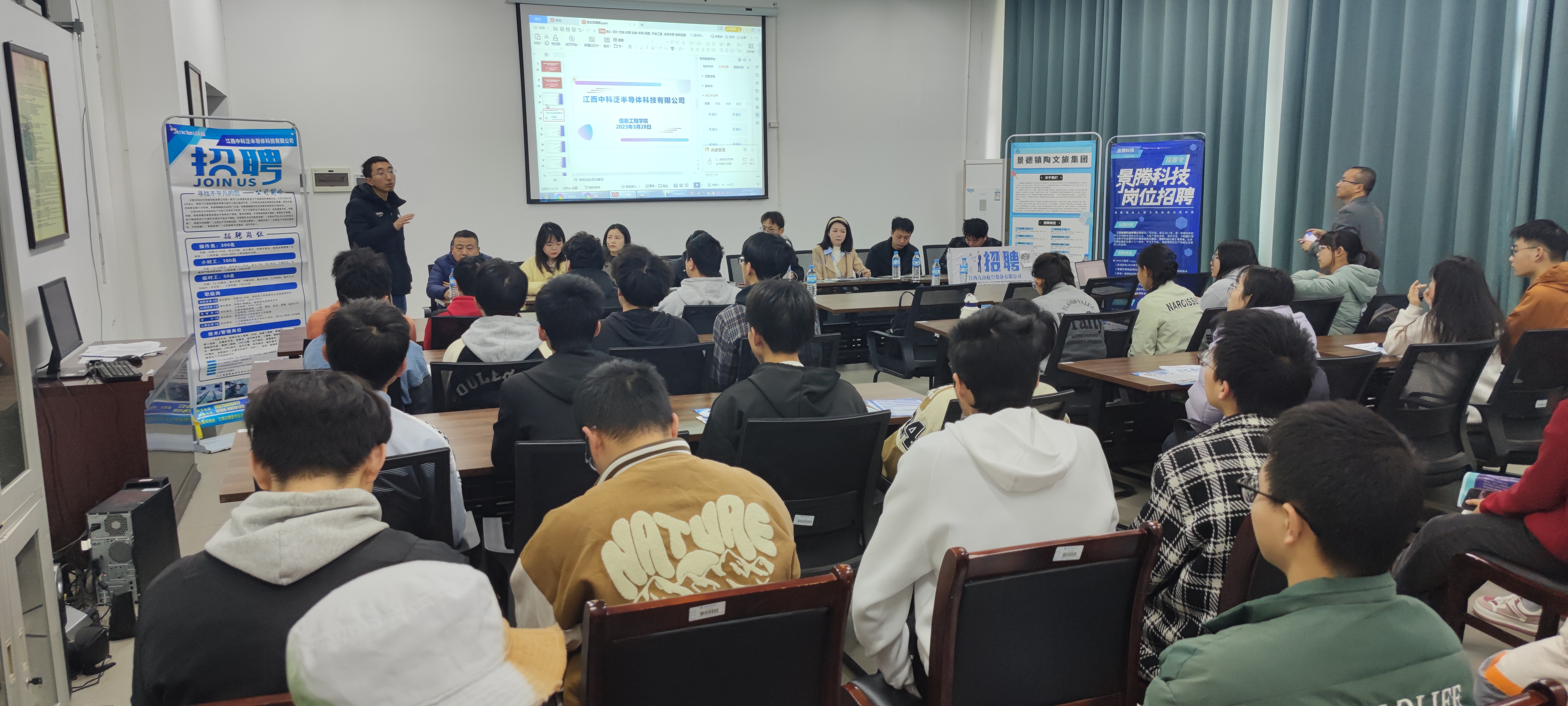 (本网讯:何强)为做好毕业生精准就业服务,拓展就业渠道,促进毕业生就业。3月28日上午,信工学院对接浮梁县就业创业服务中心,邀请了江西九由航空装备有限公司、江西中科泛半导体科技有限公司、江西善堂科技有限公司、景德镇陶文旅控股集团有限公司、江西景腾科技有限公司、景龙特种陶瓷有限公司五家企业,在学院党员活动室举办2023年“春风行动”毕业生专场招聘会,会议由辅导员何强主持。