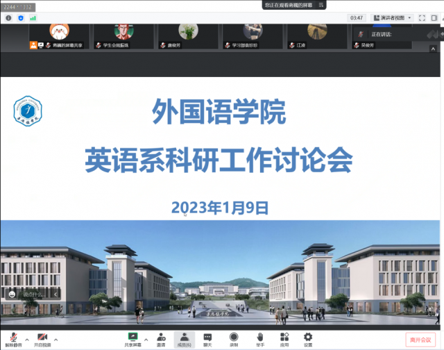 (本网讯:蒋巍)1月9日晚,外国语学院通过腾讯会议召开了英语系科研工作讨论会。外国语学院党委书记吴芹、副院长程坚、英语专业负责人吴俊芳出席会议,英语系系主任蒋巍主持会议。