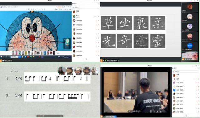 为实现“目标导向+资源先行+学生主体+评价促进”在线教学“四位一体”教学模式,教育学院全体教师通过腾讯会议、学习通、雨课堂、微信群等互动教学平台进行线上授课,同时也结合专业课程特色使得线上课堂形式丰富多样:如舞蹈课程实现学生训练与教师示范线上有效融合;书法课程实现线上实训翻转;手工课实现学生动手教师指导相结合;声乐课教师线上指导学生实际演练等等。