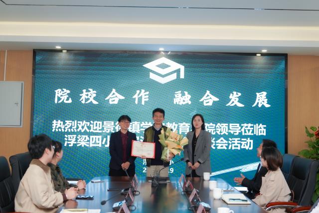 座谈会上浮梁四小还为黄书生博士举行了浮梁四小科研副校长的聘任仪式。黄书生曾有过多年的基础教育工作经历,且在教师培养和学校品牌建设方面有深厚的理论积淀和丰富的实践经验。黄书生表示,将会把在浮梁四小的工作作为自己工作的重要组成部分,努力为院校融合发展贡献一份力量。
