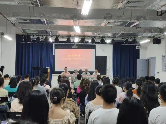 (本网讯:艾丹)为了增强2022级新生的归属感和幸福感,更好地适应大学校园生活,同时在他们心中厚植家国情怀、增强爱校荣校意识,用实际的教育行动强化高校思想政治教育,9月15日,教育学院举行以“迎新正当时,聚焦二十大”为主题的2022级新生见面会暨开学第一课。会议由副院长黄书生主持,院党委书记李莉、行政负责人冯兵、领导班子成员汪潇出席会议。