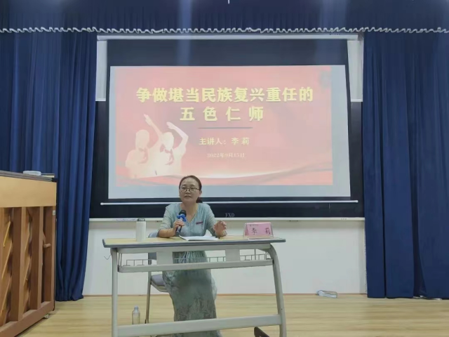 会上,院党委书记李莉为22级新生讲授开学第一课——“争做能堪当民族复兴重任的五色仁师”主题党课,加强新生理想信念教育。首先,她对同学们步入“自强不息 泽土惠民”的景德镇学院,走进“德为人先,学为人师,行为世范”的教育学院,开启“求真、务实、开拓、创新”的人生新阶段表示祝贺。对于22级新生她有以下几点寄语:一要懂得大学之道,明确人生之路。要谨记自己师范生的身份,努力修养自己的道德,以超过一般人;要努力做好学问,有充足的知识和品格来教导学生;要努力树立自己的形象,规范自己的行为,为世人做个好的典范。二要珍惜伟大时代,善待美好时光。要读懂时代、读懂大学、读懂自己,要热爱专业,掌握知识,坚持党建引领,深入融合我院“五色仁师”(红、蓝、绿、金、黄)党建品牌,努力成长为堪当民族复兴重任的德智体美劳全面发展的社会主义接班人。三要培养高尚品质,争做五色仁师。胸怀“国之大者”,敢于担当重任、勇立时代潮头,把个人理想追求融入党和国家事业之中,立志为实现中华民族伟大复兴的中国梦贡献自己的智慧和力量。四要弘扬中华优秀传统文化、廉政文化、工匠精神等,组织“礼敬中华传统文化“我们的节日”、民俗文化等传统文化活动;积极开展开学典礼,毕业典礼等仪式教育;开展《知校情 习校训 传校魂》校训传诵;班班传唱《景德镇学院校歌》,唱响爱校荣校最强音的校歌传唱;《忆校史 展未来》的校史讲述等校园文化活动。她强调,党的二十大即将召开,希望同学们自觉扛起高校大学生的政治担当,争做堪当民族复兴重任的先锋队、突击队、攻坚队,在坚定理想中长志气,在自强奋斗中硬骨气,在增长本领中蓄底气,踔厉奋发、勇毅前进,用实际行动践行“请党放心,强国有我”的铿锵誓言。