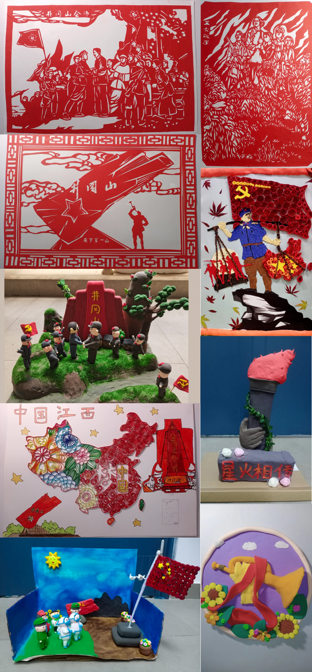 同学们通过探寻红色历史足迹,搜集整理江西红土地上的红色故事、红色精神、红色景点,通过剪纸、黏土制作、衍纸制作等手工作品来讲述江西红色故事、传承红色基因、弘扬革命精神。