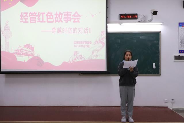 (本网讯:文|周冰/图|齐婉婷)为深入推进党史学习教育,铭记红色历史,传承红色基因,弘扬红色精神,11月26日晚,经济管理学院“穿越时空的对话”红色故事演讲比赛在1302教室举行。21级财务管理1班夏雅欣同学主持。