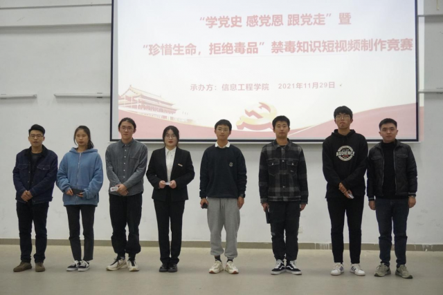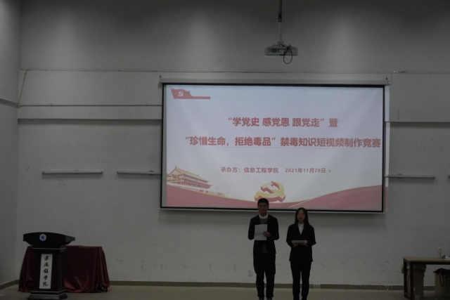 (本网讯:图|杨伊/文|王定强)为加强禁毒宣传教育,引导广大学生“珍惜生命,拒绝毒品”,提升学生禁毒意识和拒毒防毒能力。11月29日,信工学院“珍惜生命,拒绝毒品”禁毒知识短视频制作竞赛在外语楼报告厅举行,比赛由21计科2班王定强和21网工1班何越同学主持。