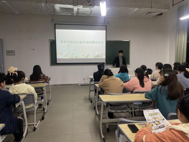 (本网讯:罗茜)为进一步扩大毕业生的就业渠道,提升毕业生的就业质量,10月27日晚,教育学院2022届学前教育专业就业专场招聘宣讲会在多媒体教室举行。温州百佳教育集团宣讲员肖圣乾主讲。