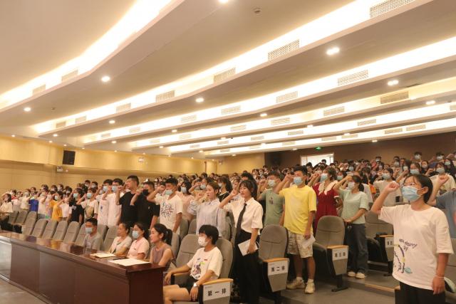 全体新生在班子成员汪潇带领下立下“争当新时代合格大学生,朝有理想信念、有道德情操、有扎实学识、有仁爱之心的四有好老师而奋斗!”的誓言。