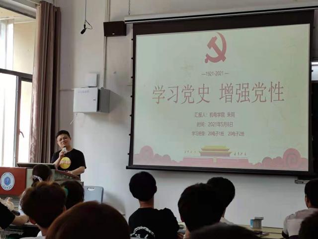 (本网讯:朱同)为喜迎建党100周年,激发同学们以饱满的精神、奋进的姿态投入学习。5月8日下午,机电学院在教学楼2301开展“学习党史,增强党性”主题教育活动,活动由辅导员朱同主持。