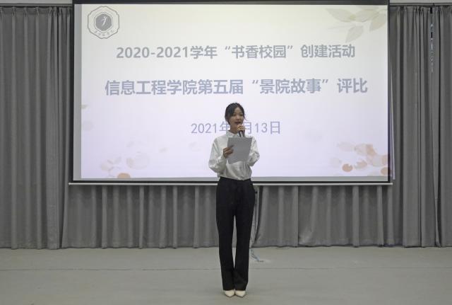 (本网讯:文|钟景/图|黄翔)为传播景院好声音、传递正能量,营造良好学习氛围,激励广大学生不忘初心、牢记使命、立志成才,5月13日晚,信息工程学院“学党史、铸初心、担使命”景院故事评比活动——决赛在第三报告厅举行,20网工2班郑萌同学主持。