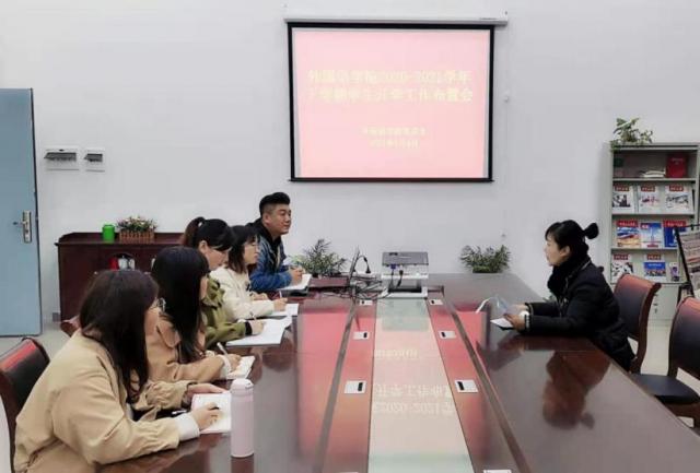 (本网讯:孙幼皓)近日,外国语学院在院会议室召开2020-2021学年下学期开学工作布置会。党总支副书记吴芹,辅导员倪娅、蒋念、万丽佳和余珊珊参加会议,会议由学生科科长孙幼皓主持。