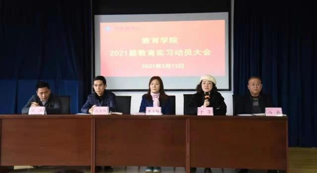 (本网讯:艾丹)为了让即将步入社会的毕业生获得更多的实践经验,适应未来的教师教育工作。3月12日,教育学院在综合实训室召开2021届毕业生实习动员大会,党总支书记黄玉梅,院长于芳,副书记徐圣辉,分管教学班子成员汪潇,学前教育及小学教育教研室主任郭丽君和邹璟,教学科研科科长廖薪参加会议。会议由副院长冯兵主持。