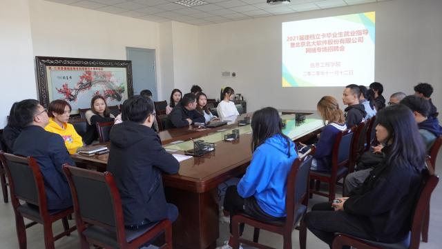 会上,辅导员虞文、马力对毕业生职业规划、大学生自主创业的相关政策、就业招聘面试技巧、个人简历制作等方面进行指导。北京北大软件股份有限公司校招负责人方和成以腾讯视频会形式向同学们详细介绍了公司简介、核心技术、业务方向、行业应用、岗位招聘要求、工资待遇、人事制度及实习生情况等。同学们就用人单位岗位实习期转正、公司内部职业晋升发展情况等方面进行提问,方和成为学生一一解答。