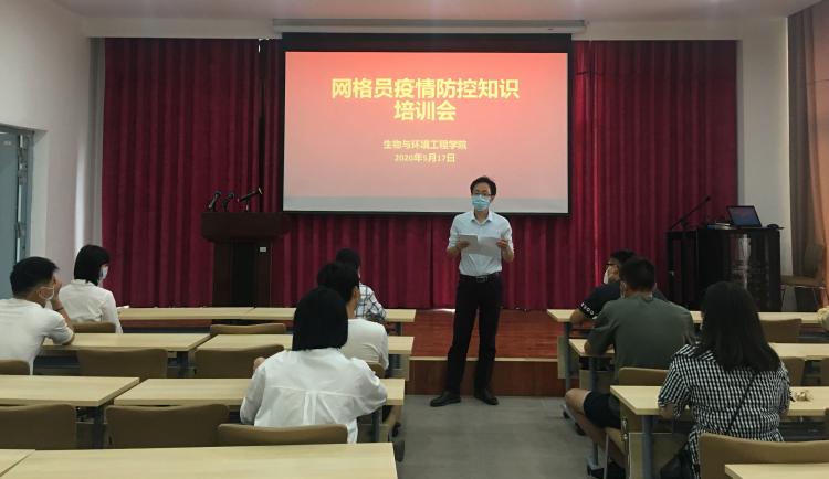 (本网讯:张天昊)为进一步落实学院网格员主体责任,保障学生返校复学工作顺利进行,5月17日,生环学院首批网格员疫情防控知识培训会在生环楼一楼报告厅召开。生环学院学工科长兼团委书记万涛主持会议。