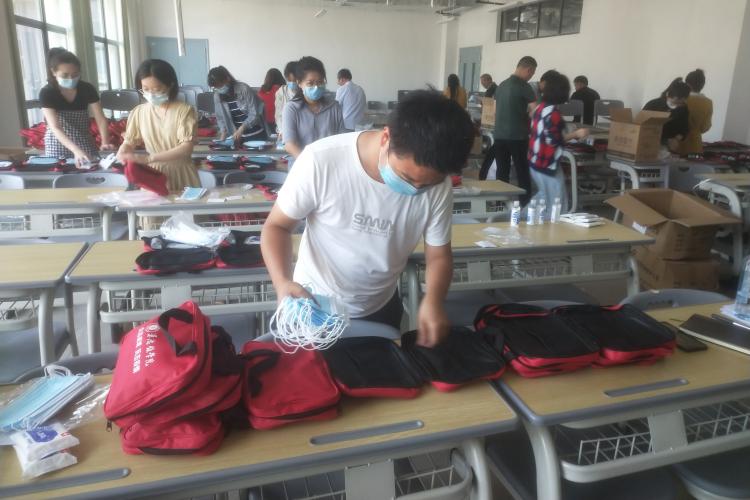 全体教师纷纷加入为返校学生准备爱心防疫包的工作中,每一个防疫包中都有1包消毒湿巾、1瓶免洗洗手液和28个口罩。防疫包虽小,却满含深重情谊,近1200个防疫包,每一个都承载着学院教师对即将返校的学生的关心和牵挂。