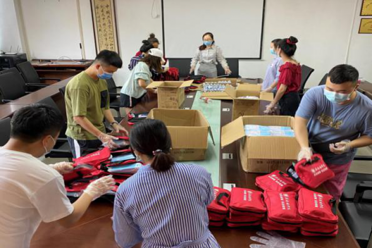 培训会结束后,李莉与辅导员带领学生党员一起为即将返校的同学们准备防疫爱心包。
