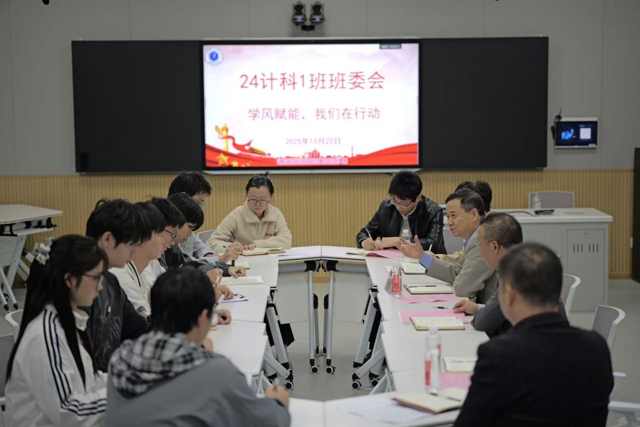 熊震宇认真听取班委发言后,对24计科1班过去一年在学风建设中取得的成绩和今后进一步的规划给予肯定。他指出,班级取得的成绩都是优良学风的生动注脚,而学风是班级发展的灵魂,班委则是学风建设的“领头雁”。他强调,班委要把信工学院“四立教育”和“七个一”成长目标融入班级工作,将研讨的好点子转化为具体行动,当好“组织者”,策划好专业竞赛、学术交流等活动;做好“服务员”,建立朋辈帮扶机制,关注学习困难同学;成为“示范者”,带头落实学习计划,引领比学赶超氛围。