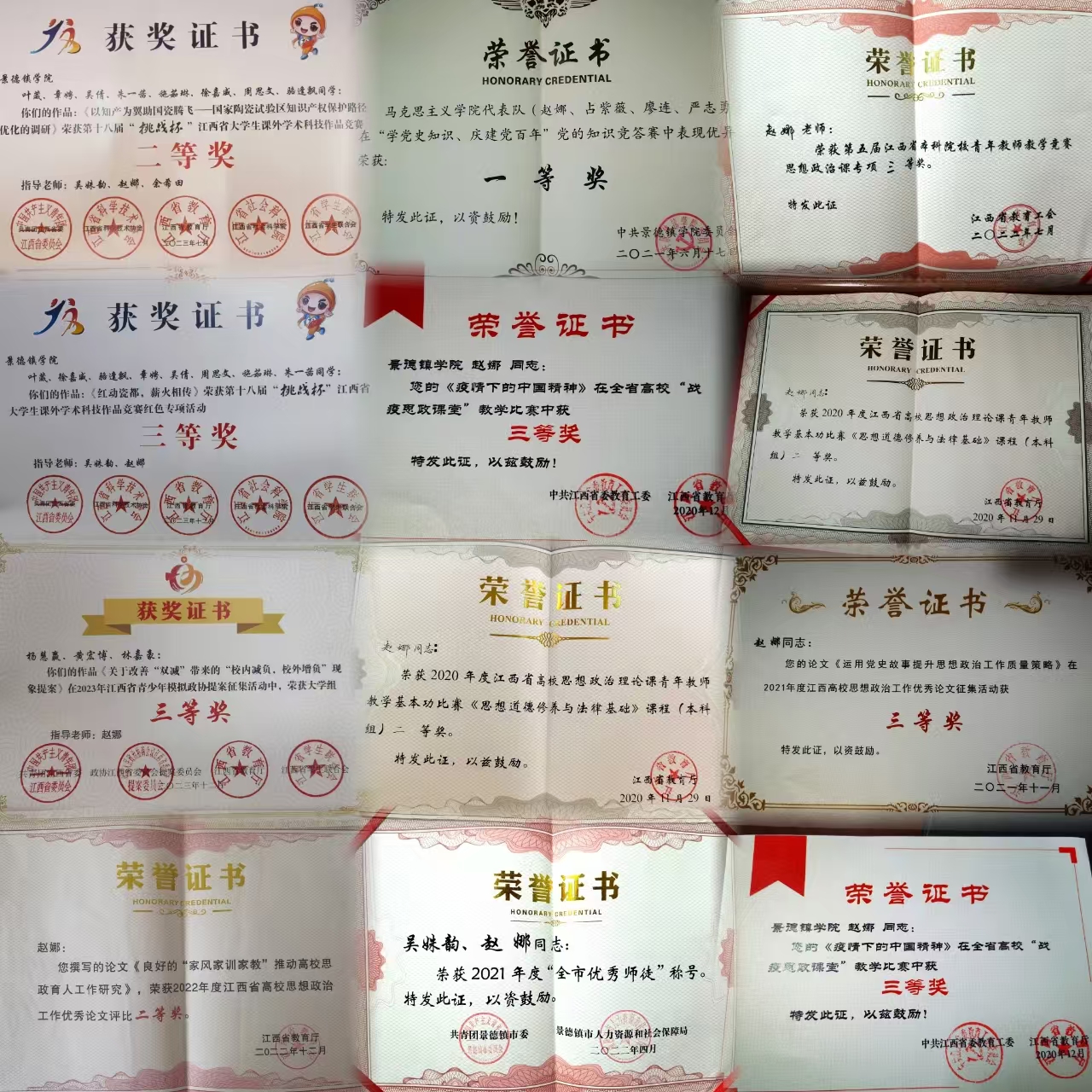 如果说德为师之魂,那么才就是师之本。作为一名思政教师,赵娜时刻注意自己的言行举止,使自己在思想、学习、劳动、生活等多方面做学生的表率,给学生树立一个好的榜样。在教书育人的过程中,始终坚持以学生为主体,发挥着主导作用。在做好本职工作之外,赵娜也积极参加各项竞赛活动:2024年荣获第六届江西省高校青年教师教学竞赛思政组一等奖后晋级全国赛,在第七届全国高校青年教师教学竞赛中荣获思想政治专项组二等奖;2022年荣获第五届江西省本科院校青年教师教学竞赛三等奖;2022年荣获景德镇学院青年教师教学竞赛思政组一等奖;2020年荣获江西省高校“战‘疫’思政课堂”教学比赛三等奖并登入“学习强国”学习平台,点击量位于前列;2020年荣获江西省高校思想政治理论课青年教师教学基本功比赛本科组二等奖;景德镇学院2024年教学创新大赛二等奖;2021年度景德镇市“全市优秀师徒”荣誉称号;2021年荣获景德镇学院“党史知识竞赛”一等奖,荣获全市“学党史,感党恩”主题征文活动中论文类二等奖,荣获市社联举办的“学习习近平总书记‘七一’重要讲话理论征文活动中三等奖。在以赛促教的同时,也积极鼓励学生参加各类赛事活动:2023年指导学生作品《以知产为翼,助国瓷腾飞》荣获江西省第十八届挑战杯二等奖;2023年指导学生参加第十八届“挑战杯”红色专项活动“红色瓷都,薪火相传”作为江西省推选项目晋级参加全国交流展示,并荣获省级三等奖;2023年指导学生参加江西省青少年模拟政协提案荣获省级三等奖。教育教学成果初显,2024年获得景德镇市“优秀共产党员”称号,评为景德镇学院“四有好老师”;2023年获得景德学院“教书育人”“省级以上教师能力比赛获奖者”荣誉称号。除此之外,年度考核两次优秀,还荣获马院教工支部优秀党员、“师德师风”优秀人员的荣誉,为学生树立有信仰、有理想、有担当、有情怀的榜样。在教书育人工作之外,积极参加各项理论研究活动和撰写相关理论文章,2021年被聘为景德镇市社会科学界联合会特约研究员。