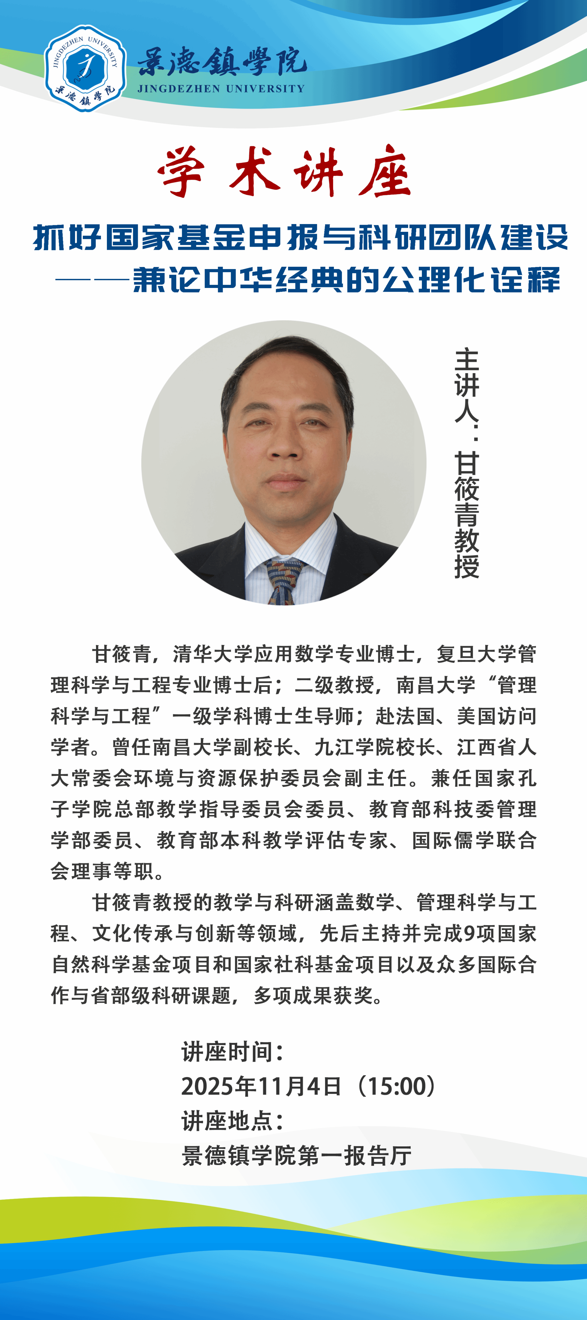 【讲座预告】甘筱青教授:抓好国家基金申报与科研团队建设——兼论中华经典的公理化诠释